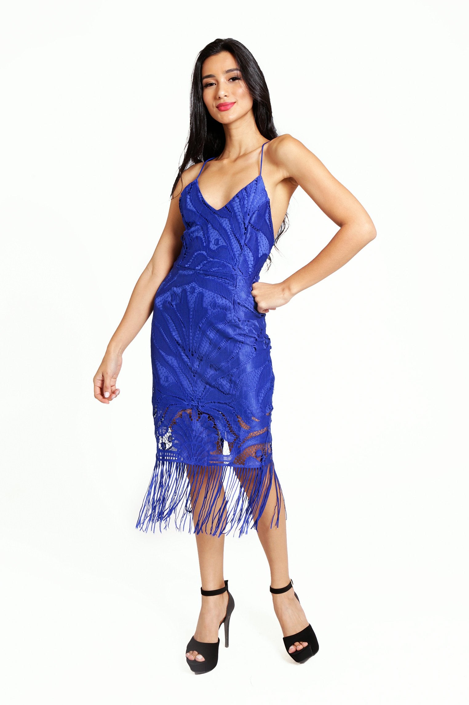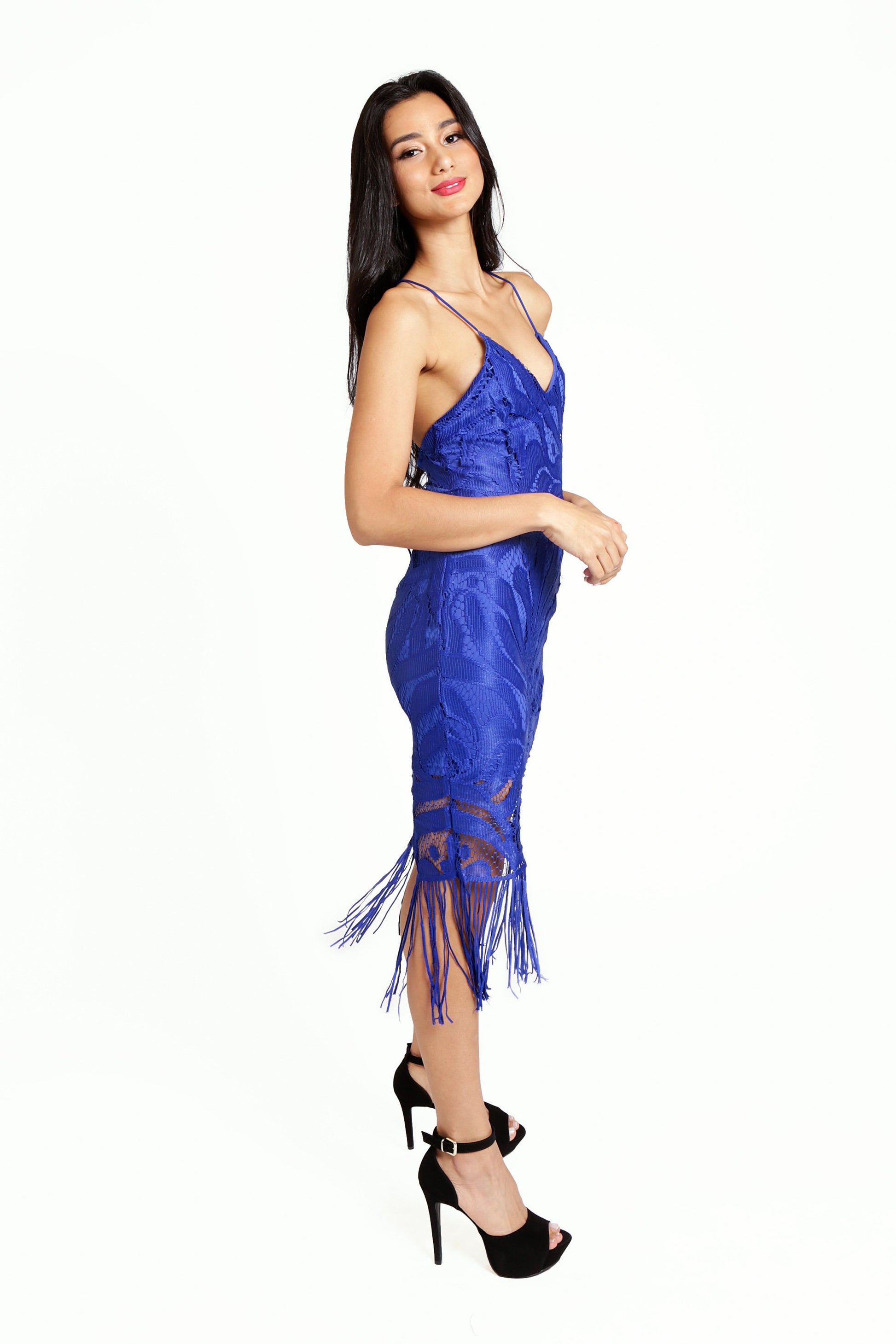 This lace dress features a low v-neckline, a figure hugging midi silhouette and chic hem tassels. It has spaghetti straps that create a back lace-up details with an invisible zip below. The delicate lace fabric is lined and non-stretch. Pair with gold accessories and be sure to turn heads!